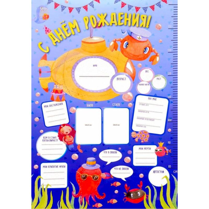 Украсит самый яркий праздник в году, организует минуты веселого заполнения, рисования и украшения, запомнит все важные факты о ребенке (рост, вес, размер ноги, достижения, мечты, крылатые фразы, любимые вещи и др., а также места под фото 10х15 см).