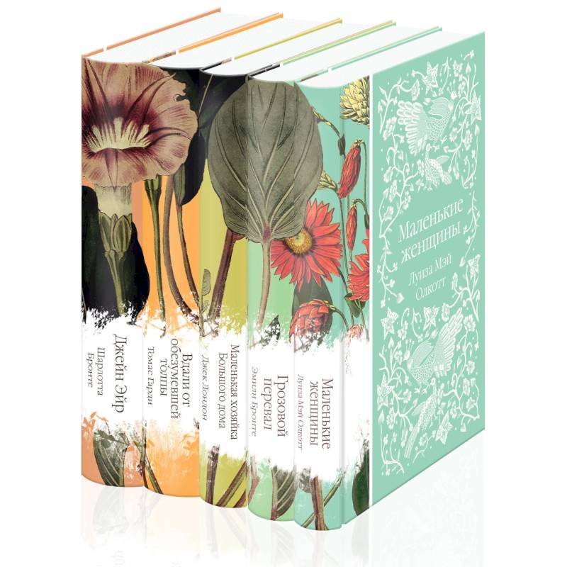 В комплект вошли «Джейн Эйр», «Вдали от обезумевшей толпы», «Маленькая хозяйка большого дома», «Грозовой перевал» и «Маленькие женщины» — пять классических женских романов, которые приятно читать и приятно дарить.