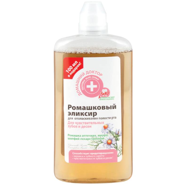 Регулярное применение ромашкового эликсира обеспечивает полноценный уход и длительную защиту чувствительных зубов и десен, придает свежесть дыханию.