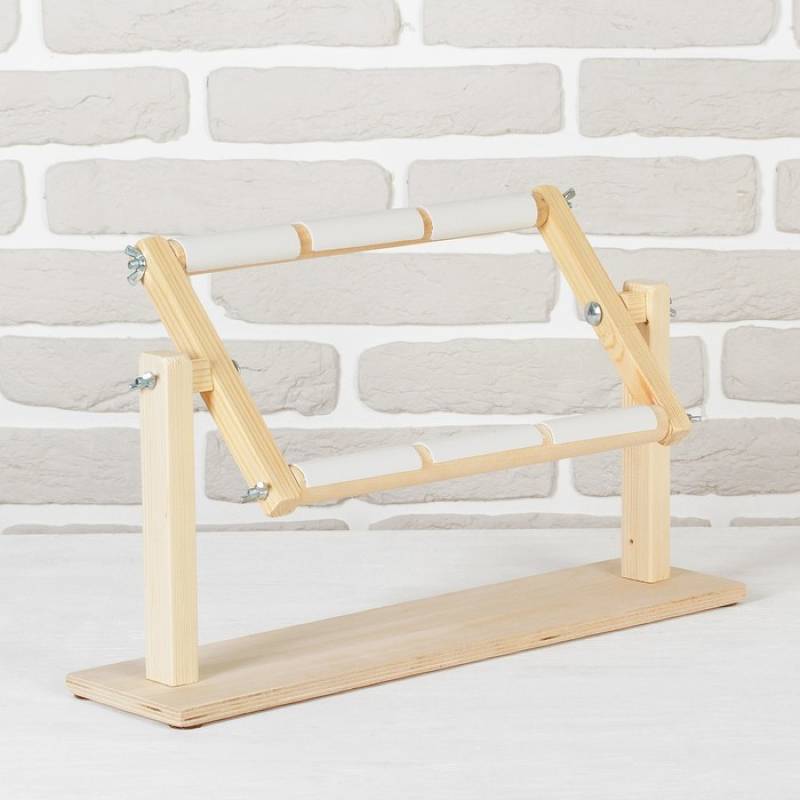 Рамка состоит из четырёх частей: двух передвижных круглых реек и двух прямоугольных боковин с отверстиями, расстояние между которыми различное. Это позволяет выбрать оптимальную ширину пяльцев.